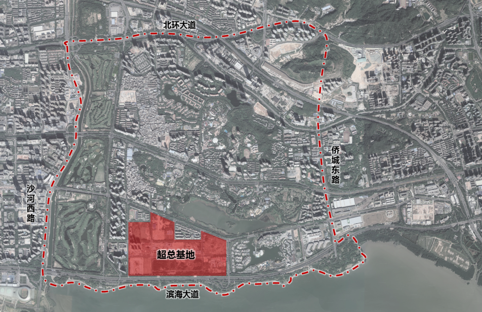 深圳湾超级总部基地位于深圳市华侨城南部滨海地区,是塘朗山-华侨城-深圳湾城市功能空间轴的核心区段之一。该片区南接深圳湾,与香港隔海相望,北倚华侨城内湖湿地,西邻沙河高尔夫球场,东至华侨城欢乐海岸;城市轨道2号线、9号线、11号线(机场快线)等在该片区交汇,使该片区成为环深圳湾地区自然景观条件得天独厚、城市门户形象突出、未来城市综合开发价值极高的区域。
