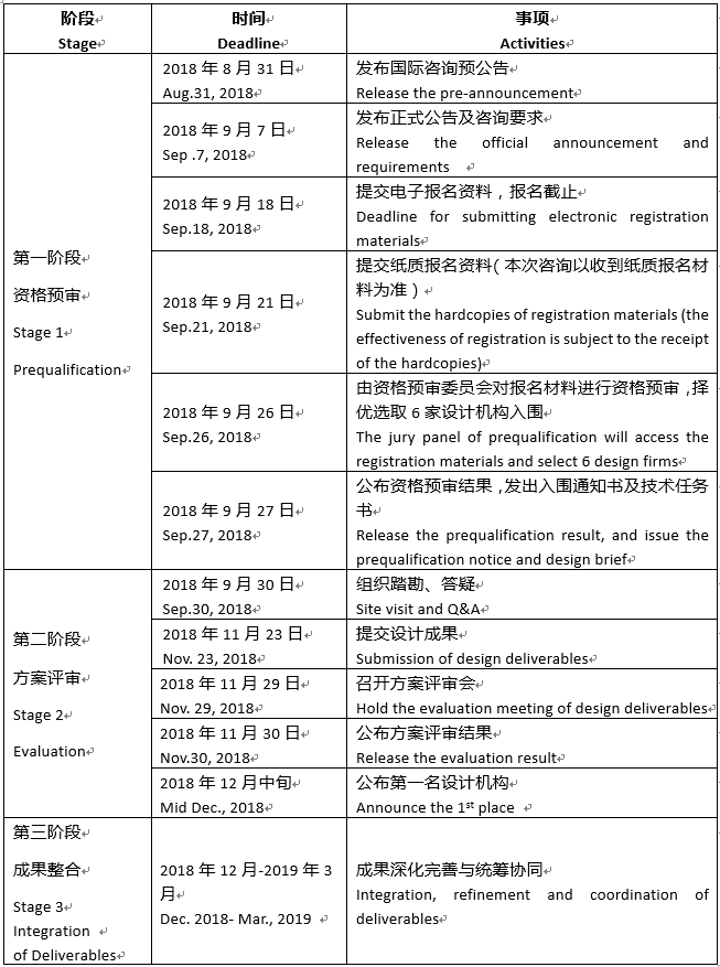 第一阶段资格预审:本次国际咨询在全球范围内公开征集设计机构参与。由资格预审委员会对报名的设计机构进行预审,从中择优选取6家设计机构参与下一阶段方案设计;